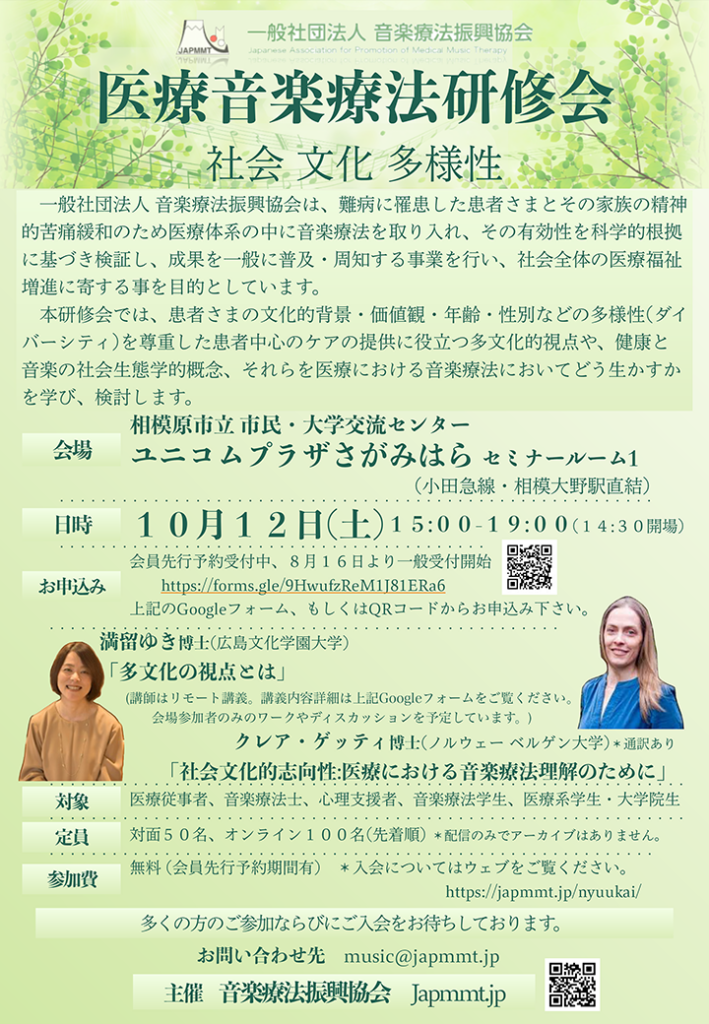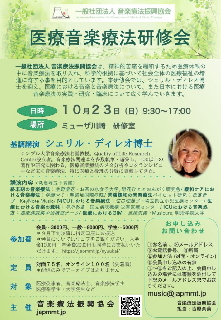 | 対象 | 医療従事者、音楽療法士、心理支援者、音楽療法学生、医療系学生・大学院生 |